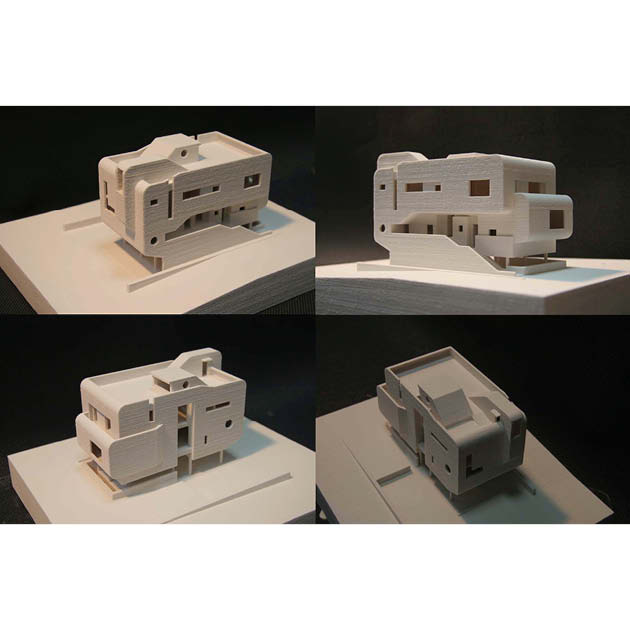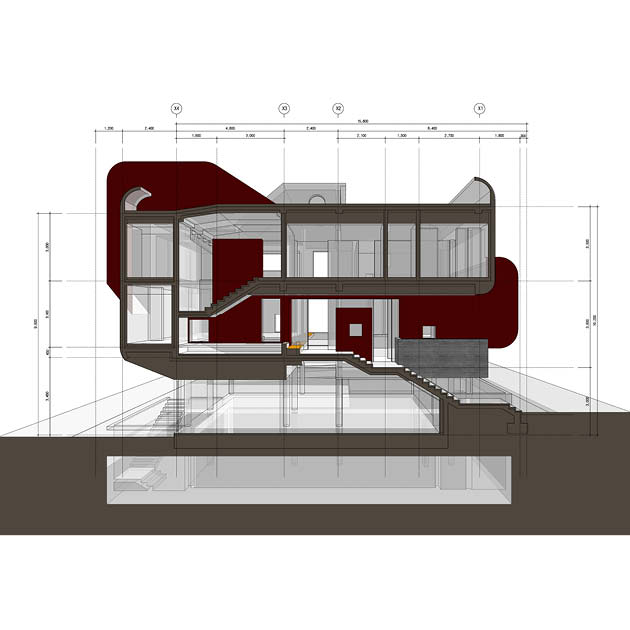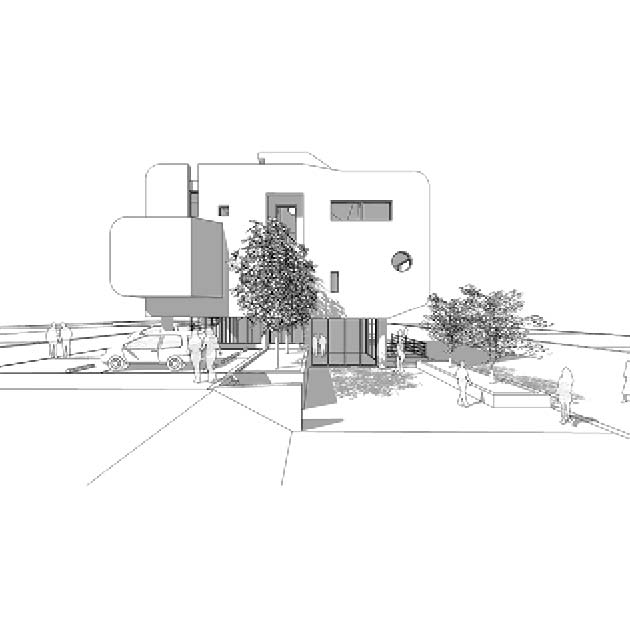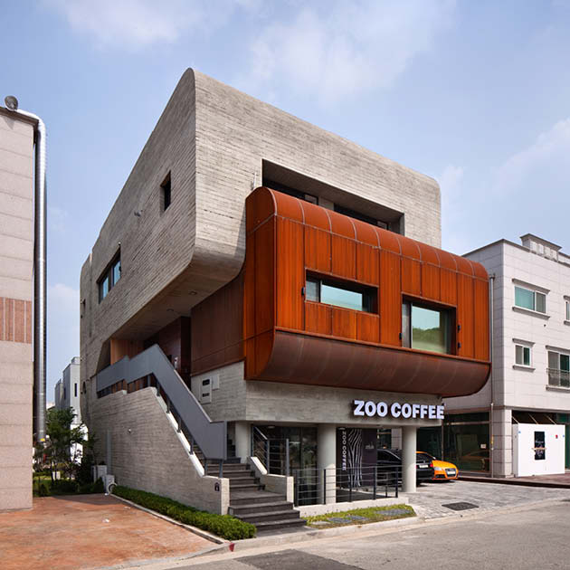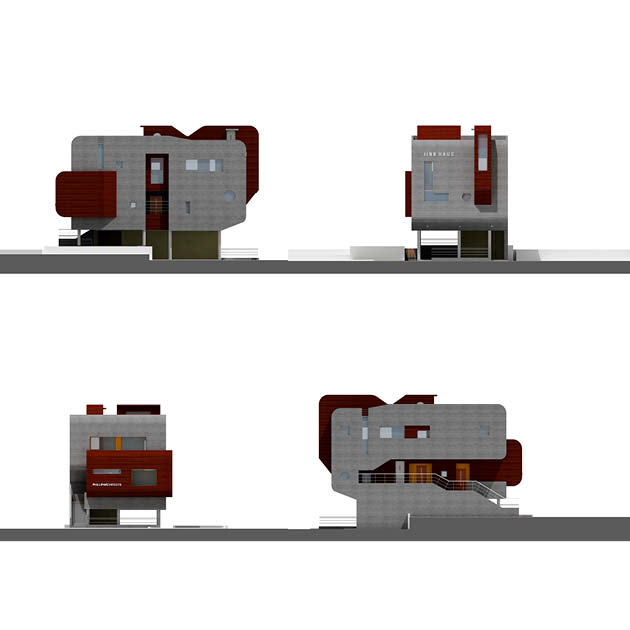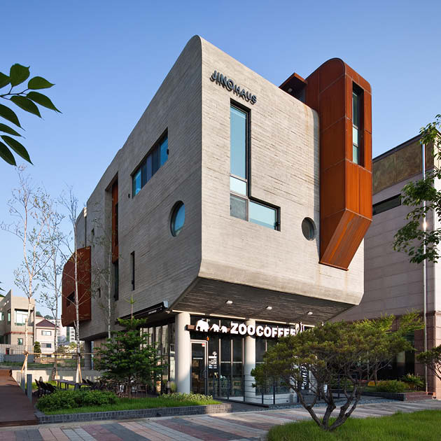 주택으로 연결되는 동선, 과도하게 돌출된 켄티레버의 사선, 옥상 파라펫의 곡선으로 이루어지는 솔리드한 느낌의 좁고 긴 노출콘크리트 매스를 공중에 띄우고, 임대세대, 거실, 계단실을 구성하는 세개의 작은 매스를 수평, 수직으로 관입시키는 느낌의 조형성으로 건물을 완성하였다.