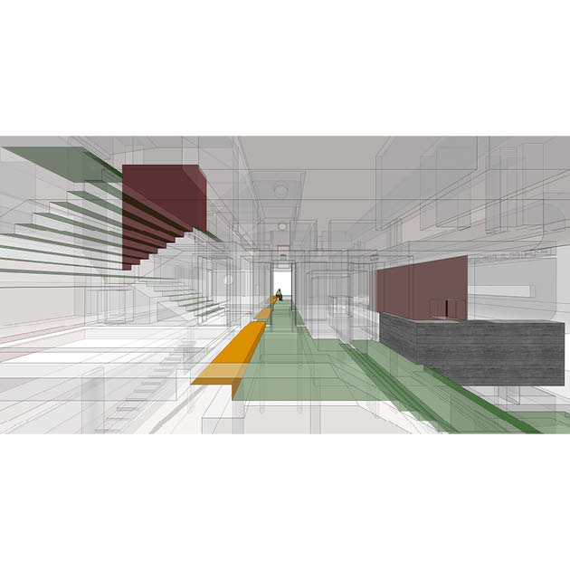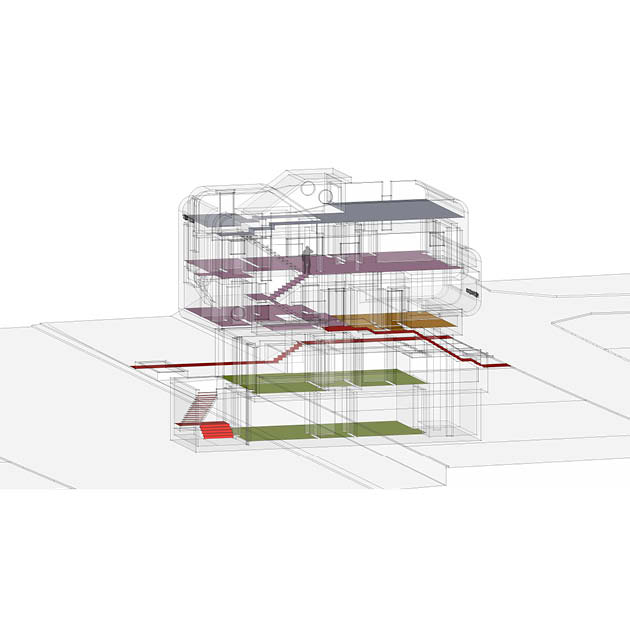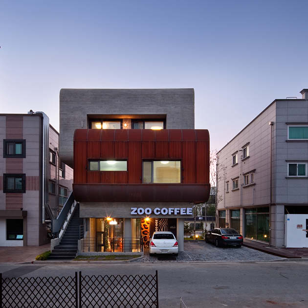 1층 근린생활시설은 보행도로와 남쪽 옥외데크와의 연계성을 위해 주로 상부 매스를 받치는 원형기둥만으로 구성하여 개방감을 주었고, 지하층은 썬큰을 통해 직접 진입하게 하였다. 주택은 동쪽 보행전용도로에 비해 1.2m 높은 레벨의 서쪽도로로부터 진입하여 조금만 올라가면 임대세대와 주인세대의 현관이 나오고, 다양한 단면의 변화로 인해 일상적이지 않은 실내공간을 경험할 수 있게 하였다.