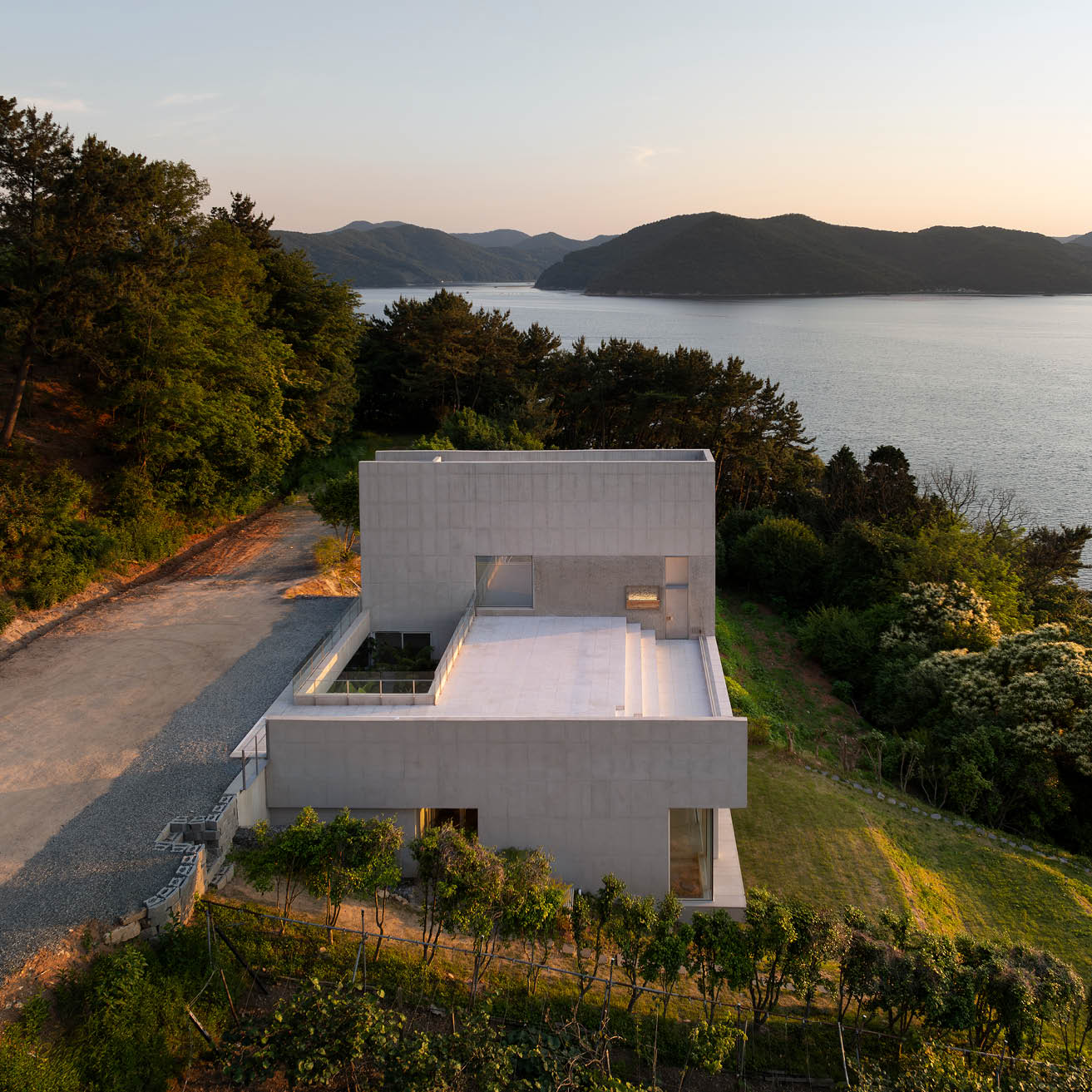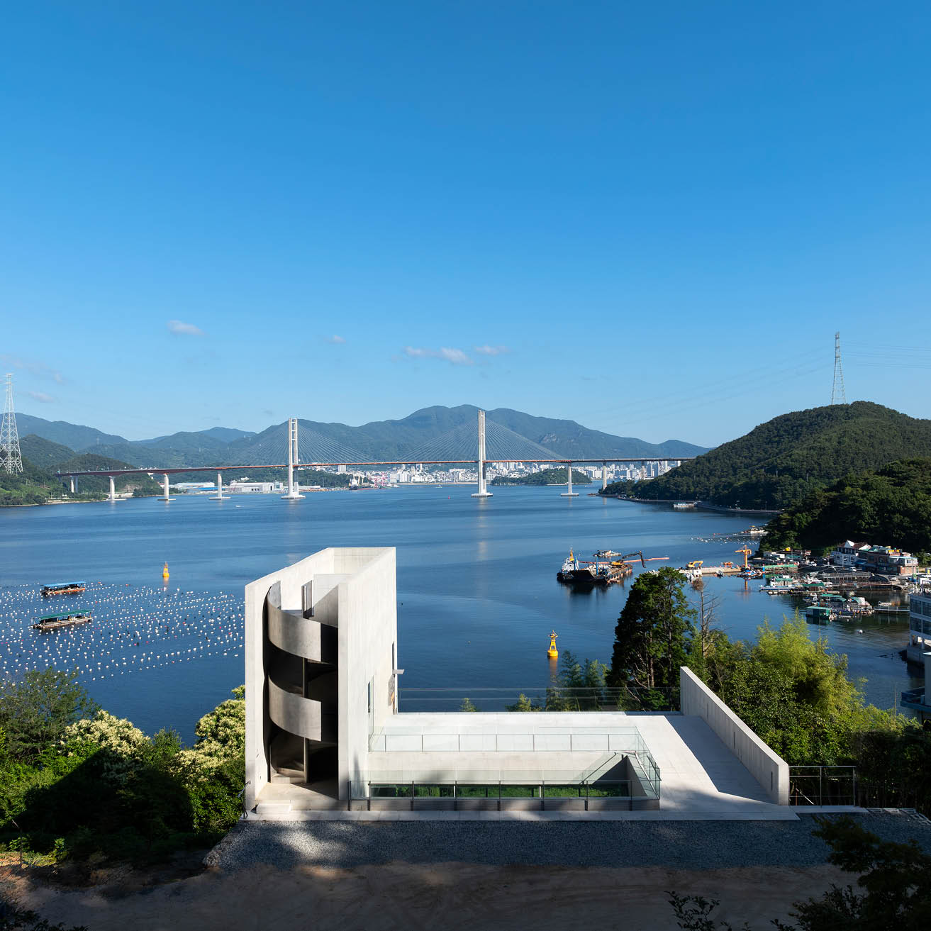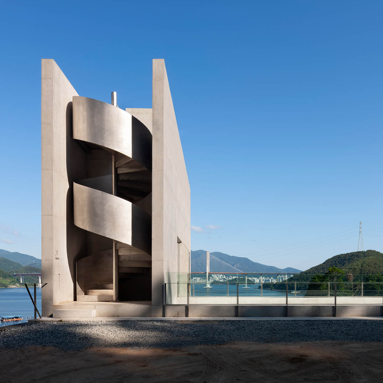 "대지의 경사를 따라 세 개의 레벨로 구성된 이 건축은 땅의 조건을 따르면서도 강철 원형 계단을 품은 단순한 콘크리트 상자가 바다를 향한 돛처럼 인상적인 존재감을 드러낸다. 수직으로 솟은 매스의 거대함과 달리, 좁은 문을 통과해 카페로 이어지는 경사로는 보이드와 빛을 통해 공간의 볼륨감을 직접적으로 경험하게 한다. 녹화된 중정과 바다를 향해 열린 넓은 개구부가 의도적으로 배치된 메인 홀은 강렬한 공간적 인상을 남긴다. 소규모임에도 다양한 시퀀스를 창출하며, 로우테크적 기법 속에서도 디테일을 놓치지 않아 세련된 완성도를 보여준다. 공간 경험의 리듬과 전환이 뚜렷하게 드러나는 이 건축은, 규모와 상관없이 장소적 아이덴티티를 창출하는 건축적 힘을 잘 보여준다."