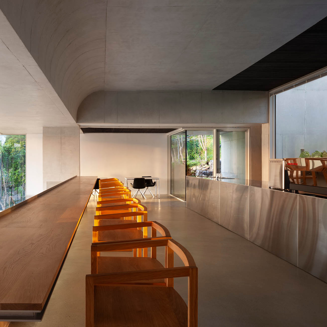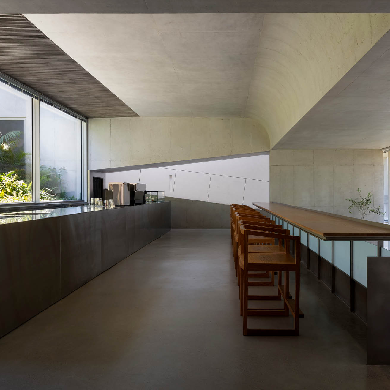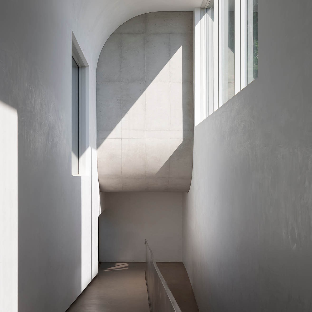 "대지의 경사를 따라 세 개의 레벨로 구성된 이 건축은 땅의 조건을 따르면서도 강철 원형 계단을 품은 단순한 콘크리트 상자가 바다를 향한 돛처럼 인상적인 존재감을 드러낸다. 수직으로 솟은 매스의 거대함과 달리, 좁은 문을 통과해 카페로 이어지는 경사로는 보이드와 빛을 통해 공간의 볼륨감을 직접적으로 경험하게 한다. 녹화된 중정과 바다를 향해 열린 넓은 개구부가 의도적으로 배치된 메인 홀은 강렬한 공간적 인상을 남긴다. 소규모임에도 다양한 시퀀스를 창출하며, 로우테크적 기법 속에서도 디테일을 놓치지 않아 세련된 완성도를 보여준다. 공간 경험의 리듬과 전환이 뚜렷하게 드러나는 이 건축은, 규모와 상관없이 장소적 아이덴티티를 창출하는 건축적 힘을 잘 보여준다."