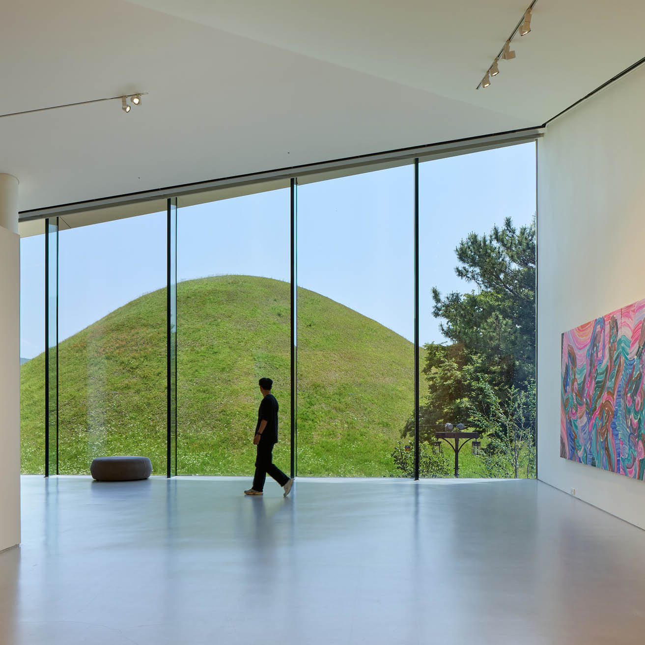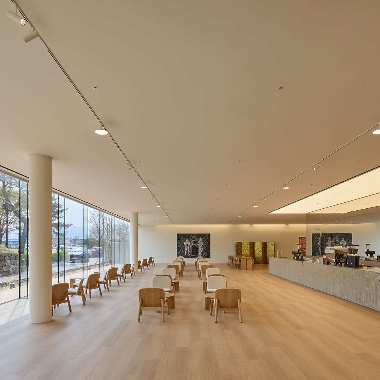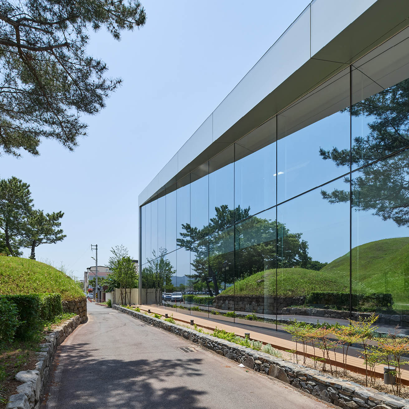 첫 번째는 외부에서 마주치는 정면 유리 파사드이다. 고도로 반사되는 유리 표면은 대릉원의 풍경을 거울처럼 비추며, 건축물 자체는 시각적으로 뒤로 물러난다. 처음부터 시선은 건물이 아니라 그 너머의 유산을 향하게 된다. 오아르미술관은 스스로를 드러내기보다, 시선을 조직하고 인식을 안내하는 조용한 역할을 제안한다. 건축은 눈에 띄는 방식이 아니라, ‘이미 거기 있는 것’을 볼 수 있도록 돕는 방식으로 주변 맥락에 참여할 수 있음을 보여준다. 이 프로젝트는 대릉원을 하나의 예술작품처럼 ‘프레이밍’함으로써, 익숙한 풍경을 배경이 아닌 ‘주제’로 재발견하도록 유도한다. 비로소 이곳은 단지 보는 장소가 아닌, 기억하는 장소가 된다.