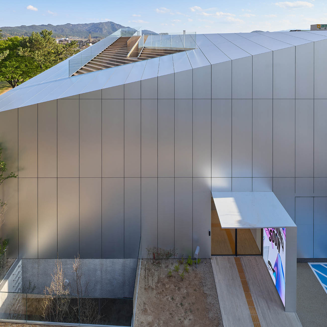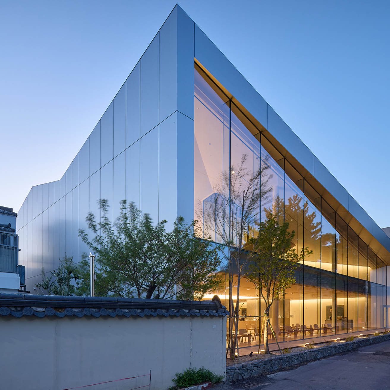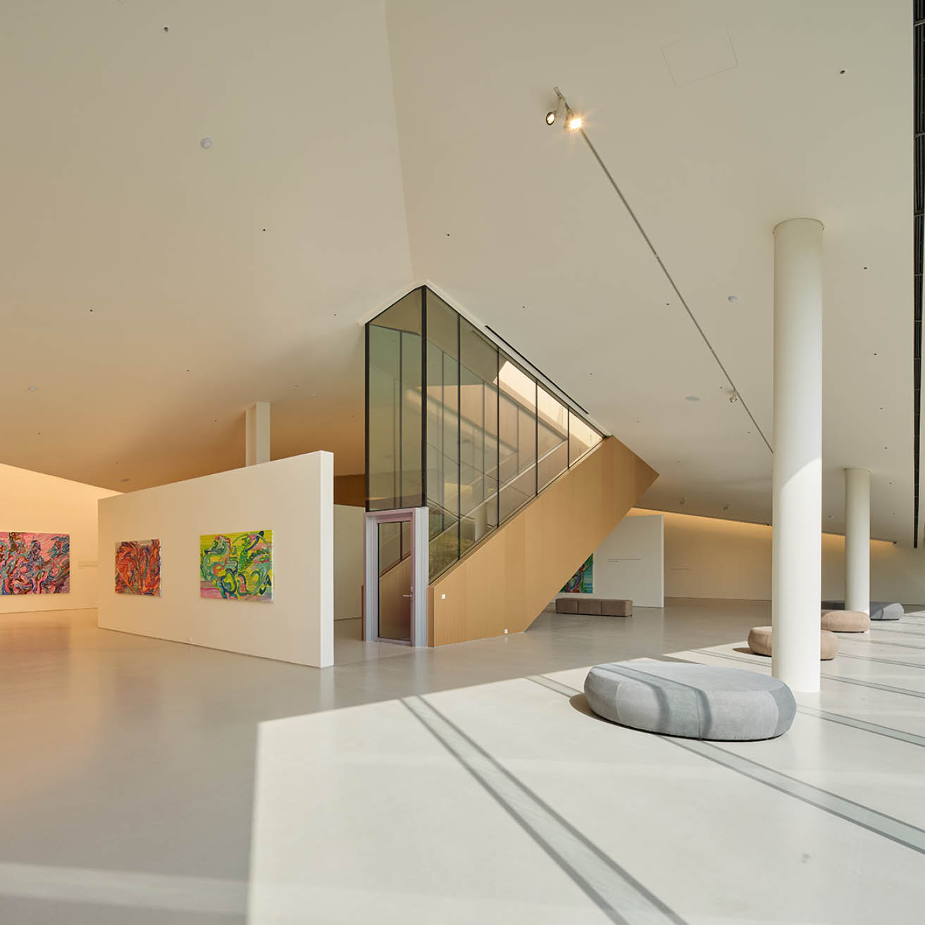 첫 번째는 외부에서 마주치는 정면 유리 파사드이다. 고도로 반사되는 유리 표면은 대릉원의 풍경을 거울처럼 비추며, 건축물 자체는 시각적으로 뒤로 물러난다. 처음부터 시선은 건물이 아니라 그 너머의 유산을 향하게 된다. 오아르미술관은 스스로를 드러내기보다, 시선을 조직하고 인식을 안내하는 조용한 역할을 제안한다. 건축은 눈에 띄는 방식이 아니라, ‘이미 거기 있는 것’을 볼 수 있도록 돕는 방식으로 주변 맥락에 참여할 수 있음을 보여준다. 이 프로젝트는 대릉원을 하나의 예술작품처럼 ‘프레이밍’함으로써, 익숙한 풍경을 배경이 아닌 ‘주제’로 재발견하도록 유도한다. 비로소 이곳은 단지 보는 장소가 아닌, 기억하는 장소가 된다.