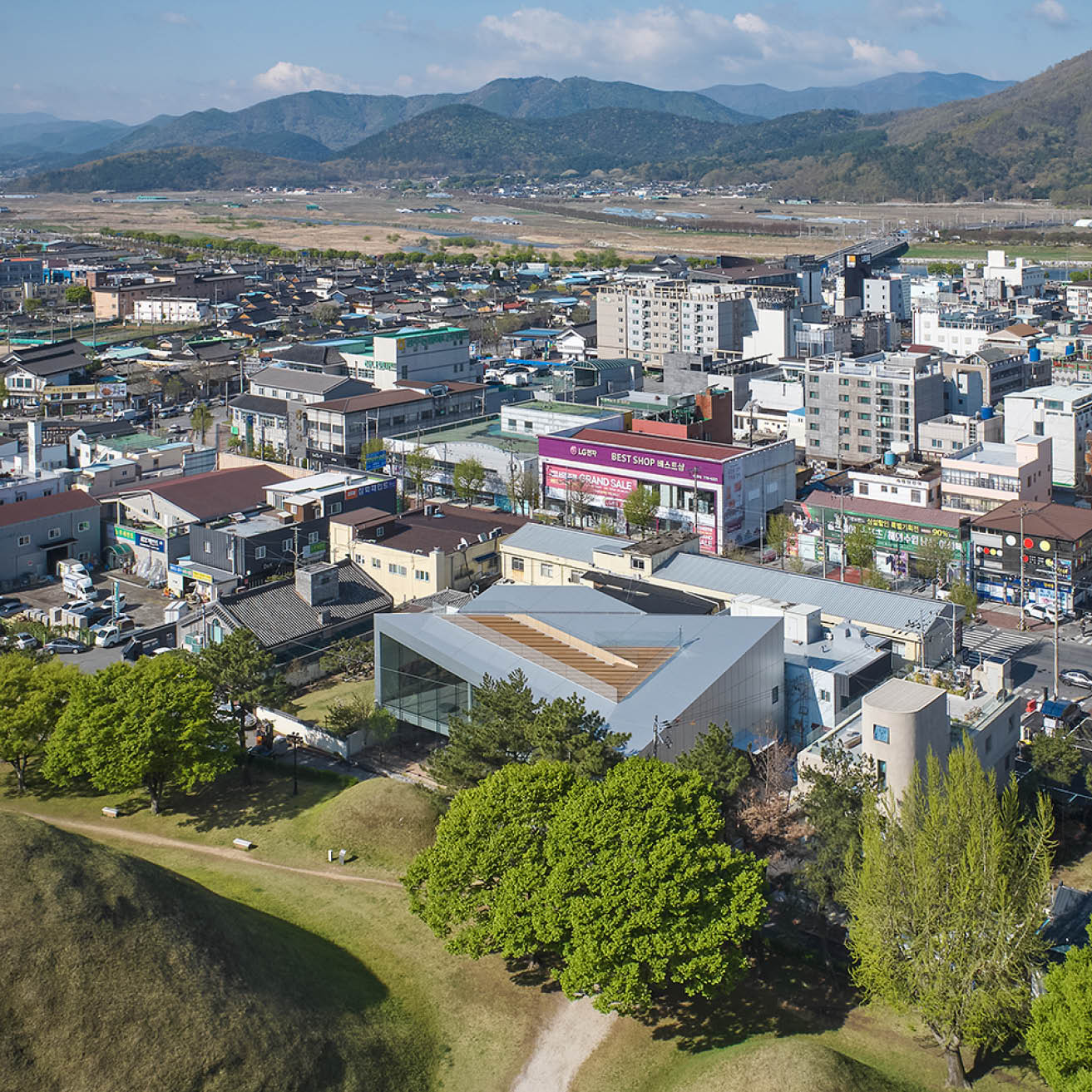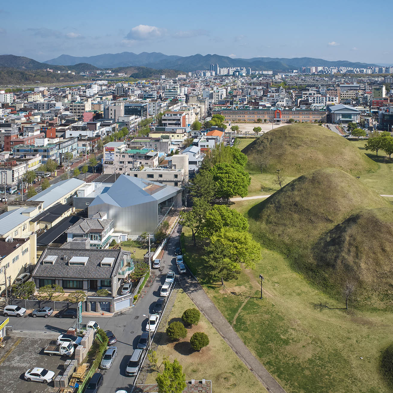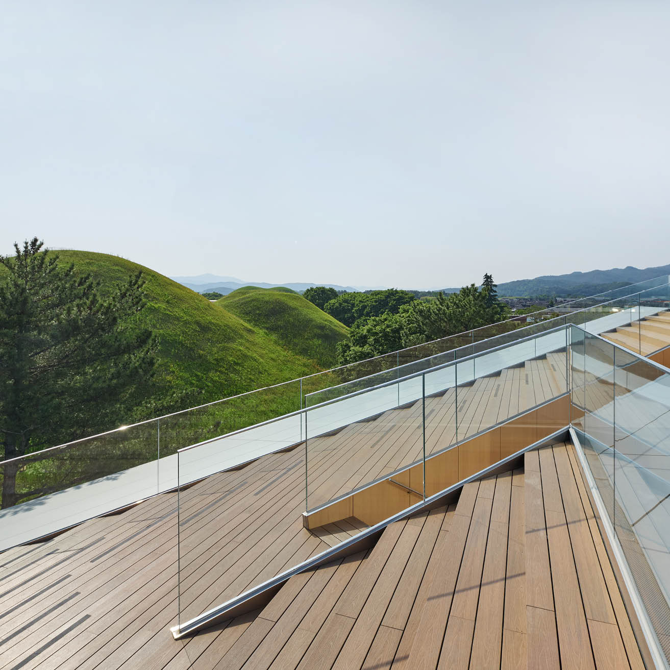 오아르미술관은 대릉원 바로 옆에 위치해 있다. 경주의 역사문화보존지구 안에 놓인 이 부지는 건축물의 높이, 형태, 외관에 대해 엄격한 규제를 받는다. 이러한 제약 속에서 이 미술관은 스스로를 드러내기보다는 주변과 조화를 이루는 방향으로 설계되었다. 과감한 조형적 제스처를 취하기보다, 이 건축은 ‘대릉원을 어떻게 담아내고 드러낼 것인가’에 주목한다. 이 미술관은 그 자체로 거대한 풍경을 감상하는 ‘프레임’이 된다. 관람자는 건축이 의도적으로 구성한 시선의 흐름을 따라 이동하며, 다양한 각도에서 대릉원을 마주하게 된다. 이렇게 이 공간은 주변의 장소를 단지 배경이 아닌 ‘사유의 대상’으로 전환시키며, 장소와 관람자 사이의 관계를 더욱 깊게 만든다. 이러한 경험은 주요한 건축적 장치를 통해 펼쳐진다.