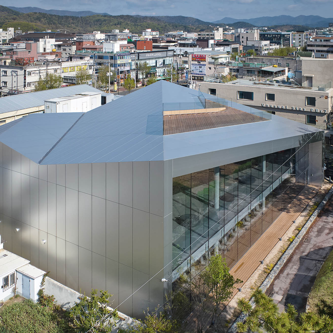 "오아르 미술관은 경주의 역사적 풍경과 현대적 건축 언어를 정교하게 결합한 작품이다. 신라 왕릉과 황리단길 사이에 놓인 대지 조건을 창의적으로 해석해 종이접기처럼 꺾인 이중 박공지붕을 만들고, 전시와 동선을 풍부하게 변주하였다. 지붕은 대릉원 방향으로 낮아지며 시선을 유도하고, 옥상은 전시 공간으로 확장된다. 관람자는 반사와 차경을 활용한 다섯 단계의 시퀀스를 통해 장소성을 새롭게 경험한다. 현대적 재료와 전통적 맥락의 대비 속에서, 건축은 단순한 전시 시설을 넘어 풍경을 전시하는 새로운 건축의 가능성을 제시한다. 특히 역사와 일상의 경계 위에서 현대 건축이 취할 수 있는 태도를 세련되게 보여주며, 장소의 기억과 현재적 경험을 동시에 열어 놓는 점에서 주목할 만하다."