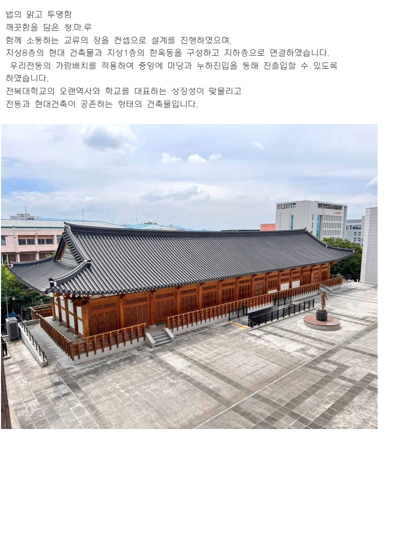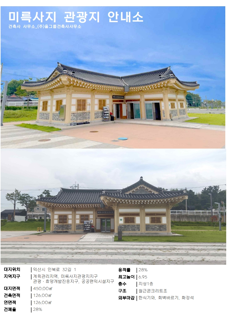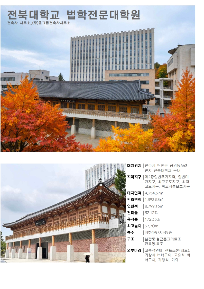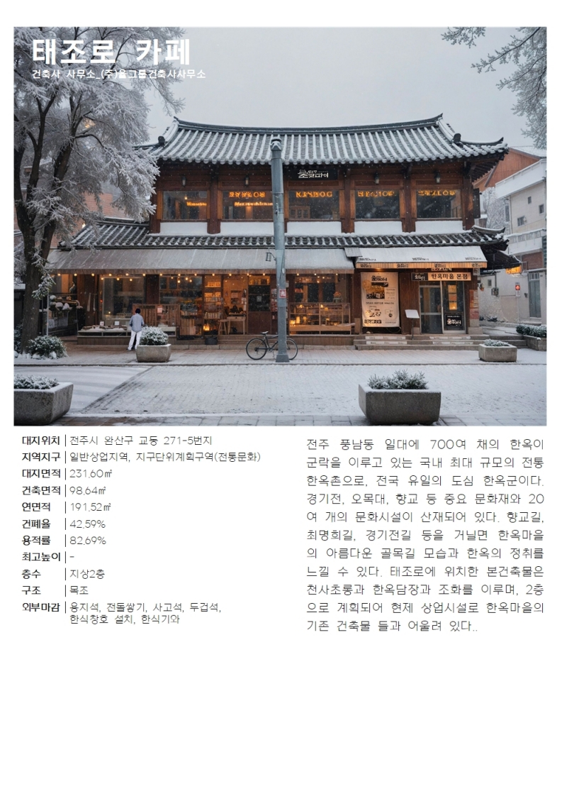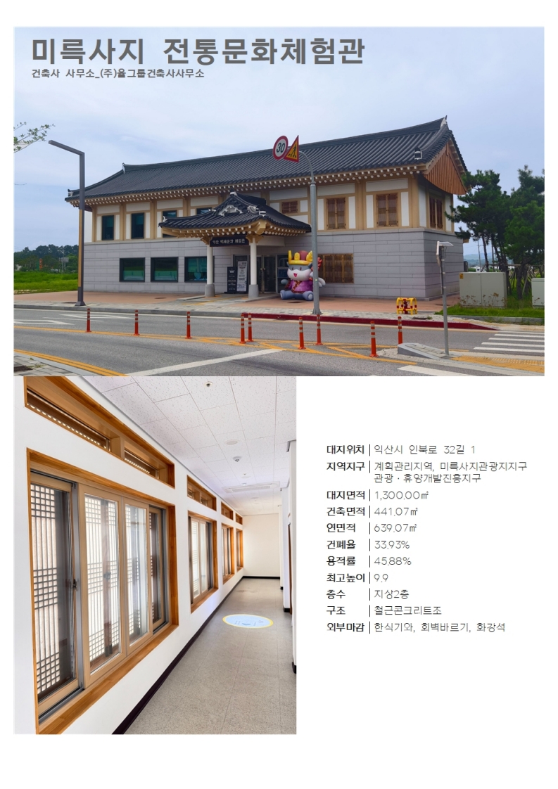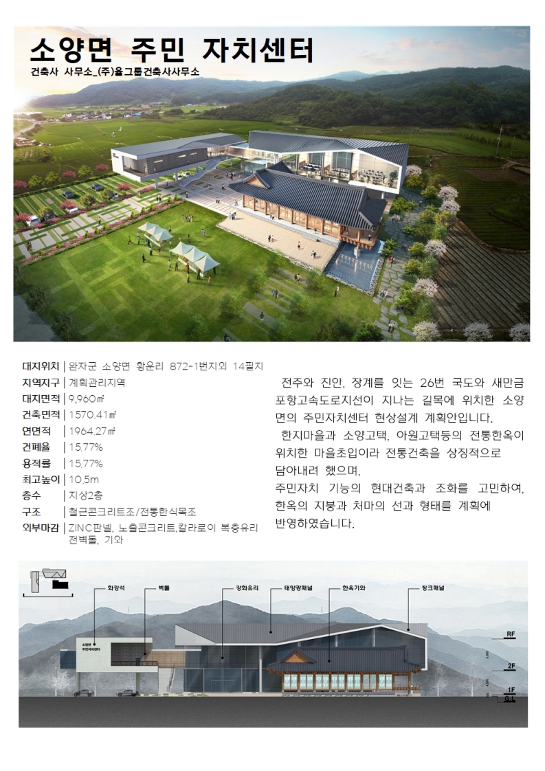 대표작품 바울교회 선교문화센터 2013 전주 양현고등학교 2015 전주 효자도서관 2016 군산시 농업인회관 2017 전라북도 전산통합센터 2018 전주 아동청소년센터 2019 더 메이 호텔 2020 전주 천년한지관 2021 힐스테이트어울림 효자아파트 2022 장수 임대형 스마트팜 2024