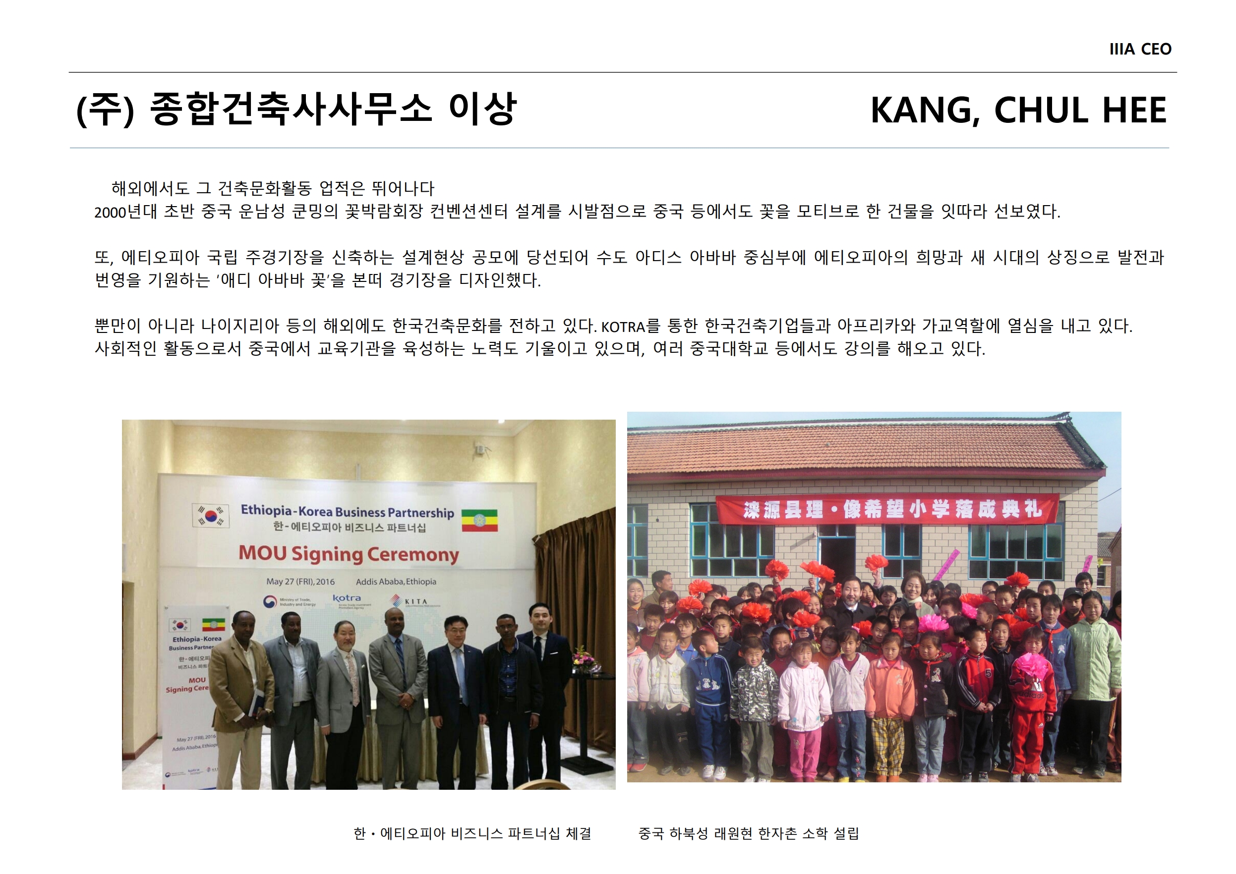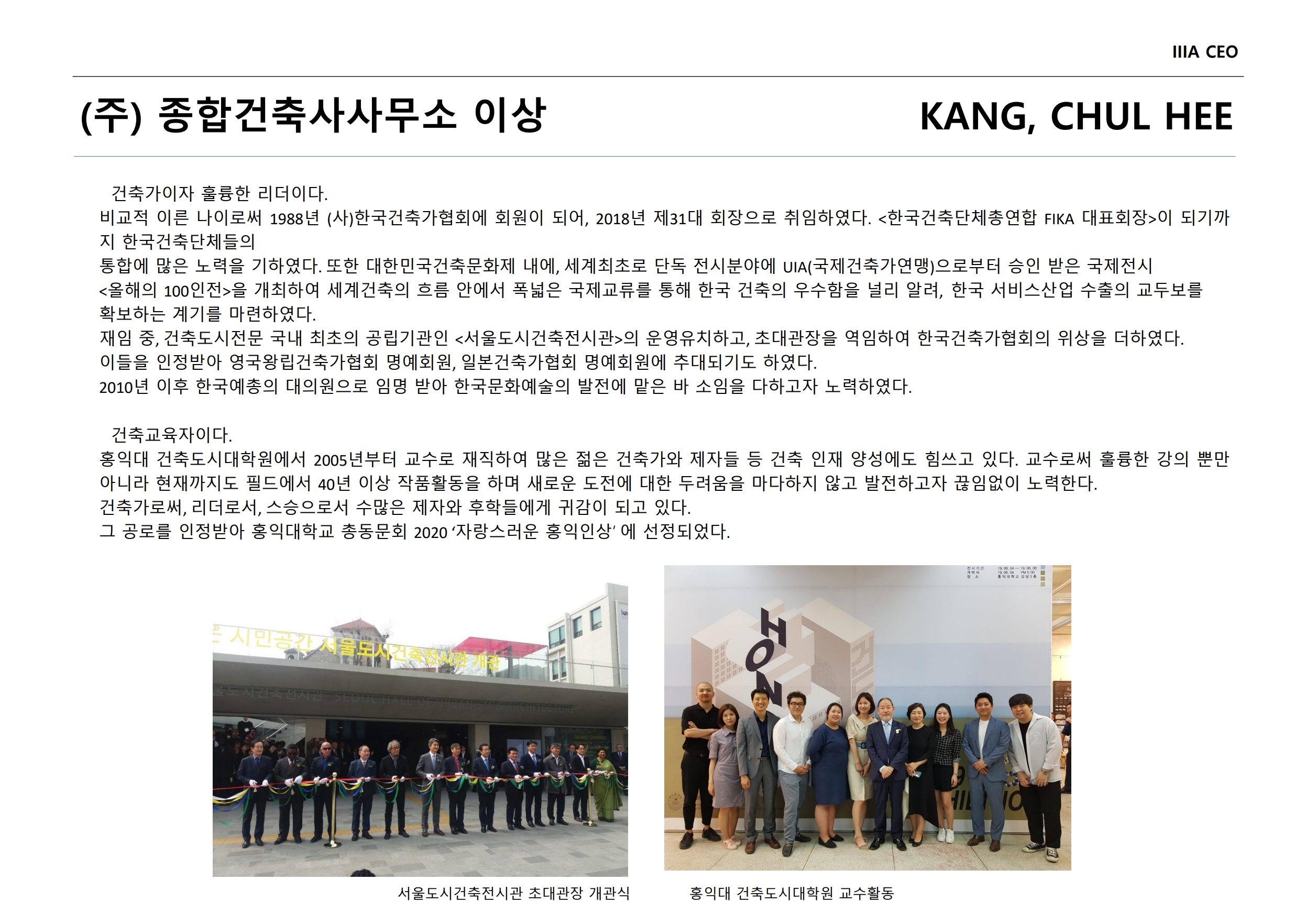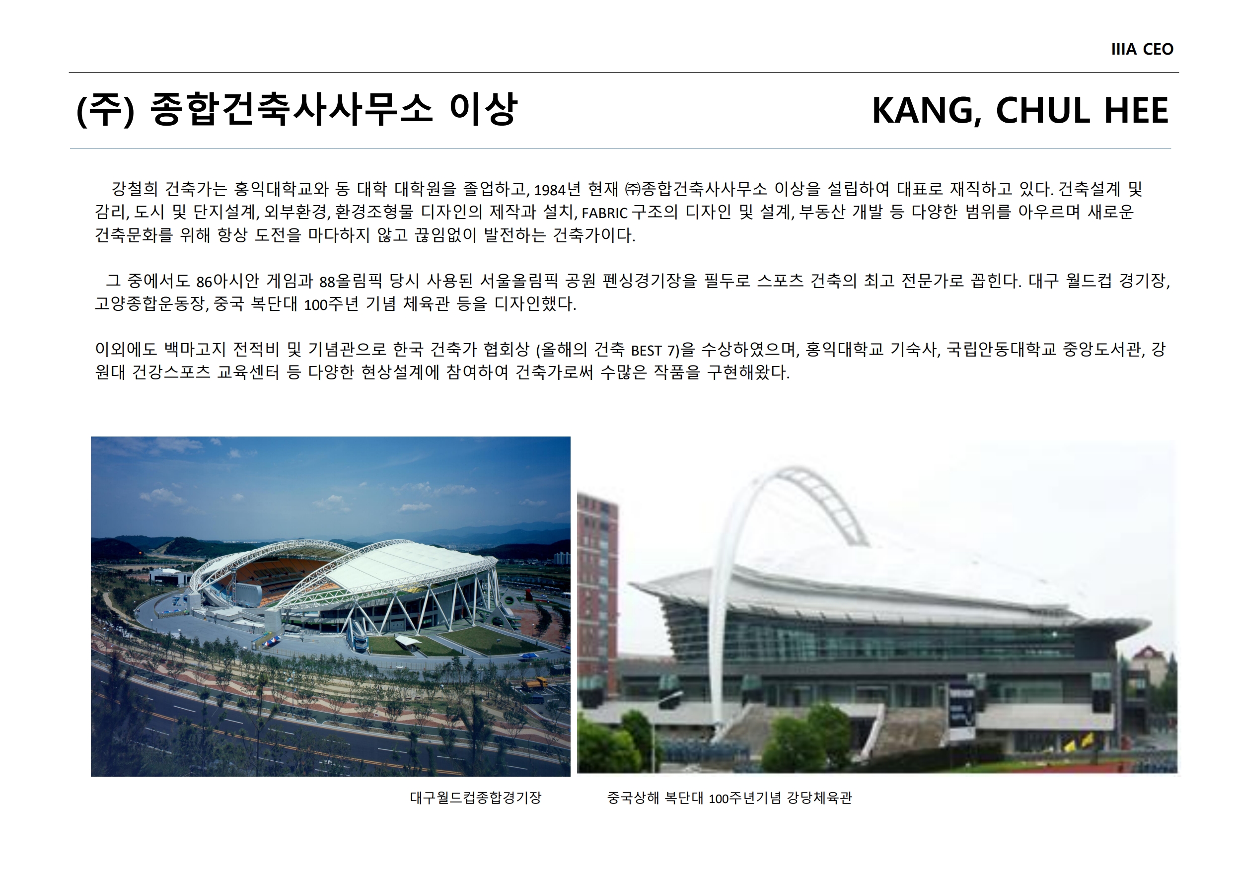 "강철희 건축가는 건축가이자 교육자로서의 삶을 통해 한국 건축의 지평을 확장해온 인물입니다. 대구 월드컵경기장 비롯한 체육시설 전문 건축가로 널리 알려져 있지만, 1984년 (주)종합건축사사무소 이상을 설립한 이래 교육, 종교, 업무, 주거시설 등 다양한 유형과 규모의 프로젝트들을 끊임없이 수행하며 폭넓은 건축적 스펙트럼을 보여주고 있으며, 특히 막구조건축디자인을 개척하여 발전시켜오고 있습니다."