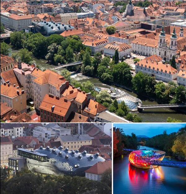 * 도판설명 : 잘 보존된 르네상스 건축으로 1999년 유네스코 세계문화유산에 지정된 오스트리아 그라츠에 2003년 건설된 쿤스트하우스 그라츠(Kunsthaus-Graz)와 무어인젤(Murinsel). 현대적 건축과 문화유산의 조화로운 '공생'을 보여주는 사례다.